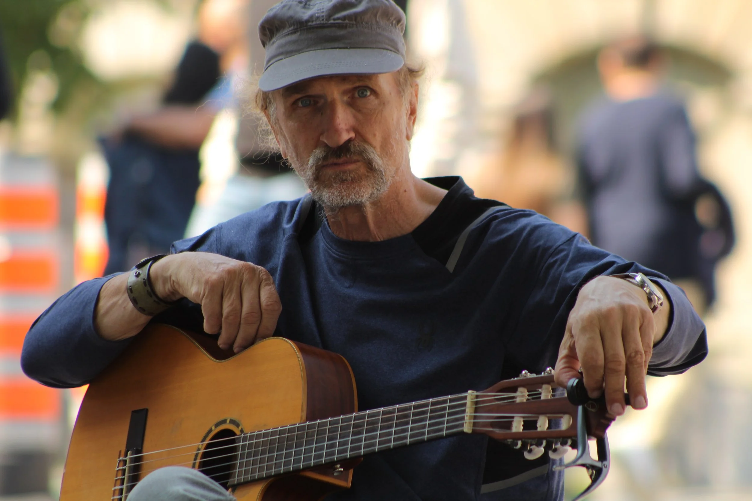 Man wearing a cap and holding an acoustic guitar outdoors. View fullsize