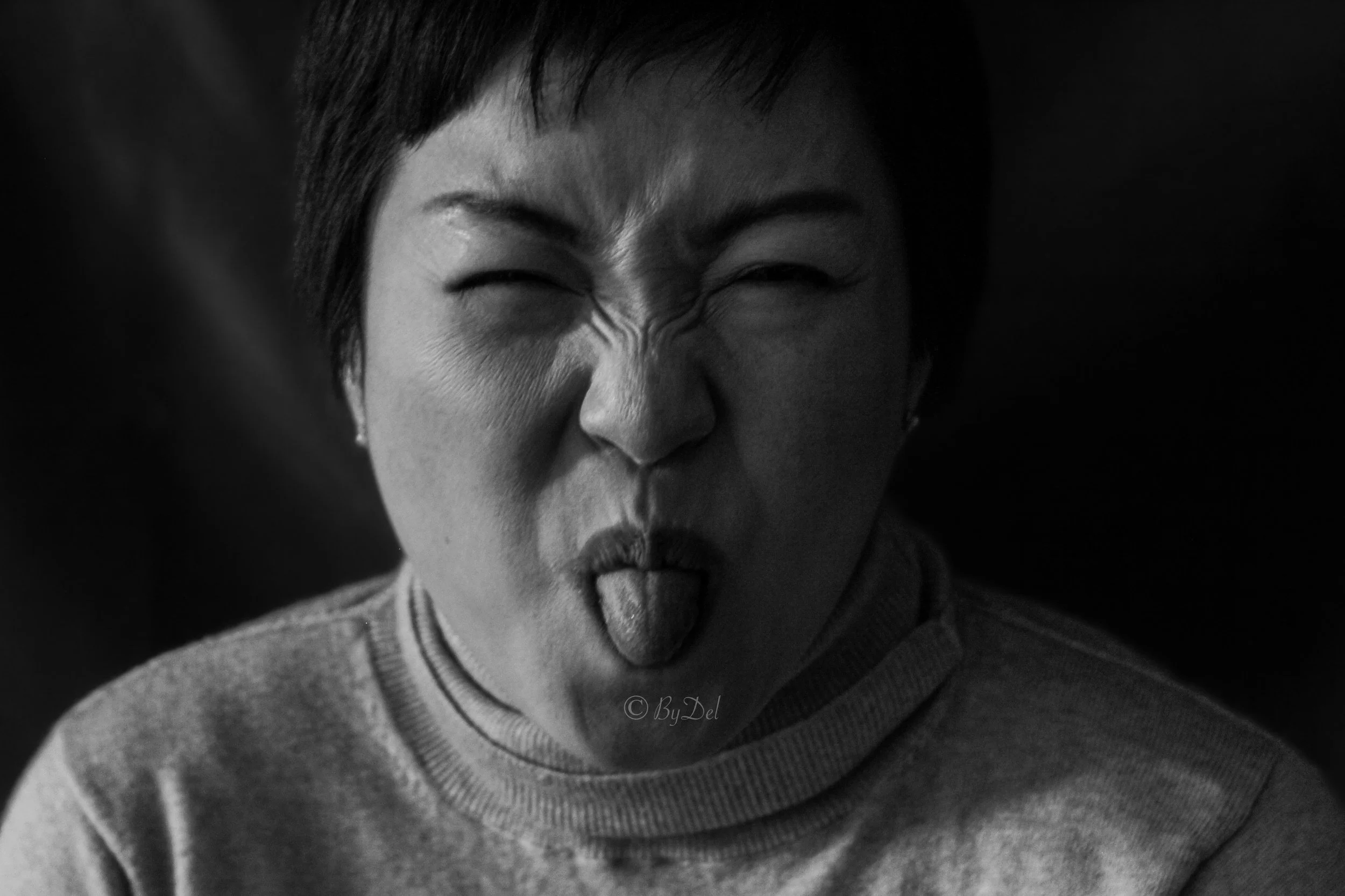 Black and white photo of a person with short hair making a funny face, sticking out their tongue with eyes closed. View fullsize