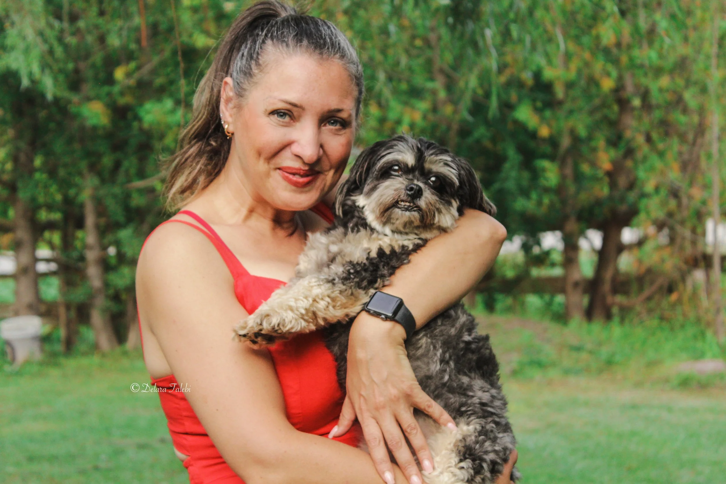 Woman in a red dress holding a small dog outdoors with green trees in the background. View fullsize