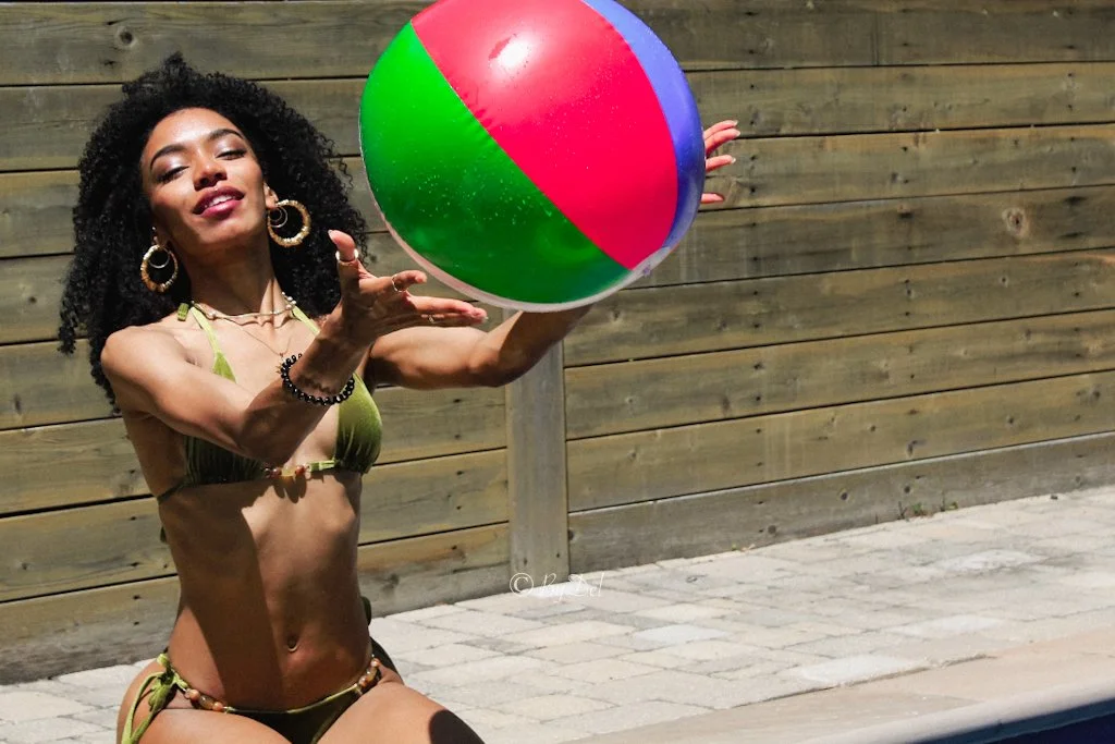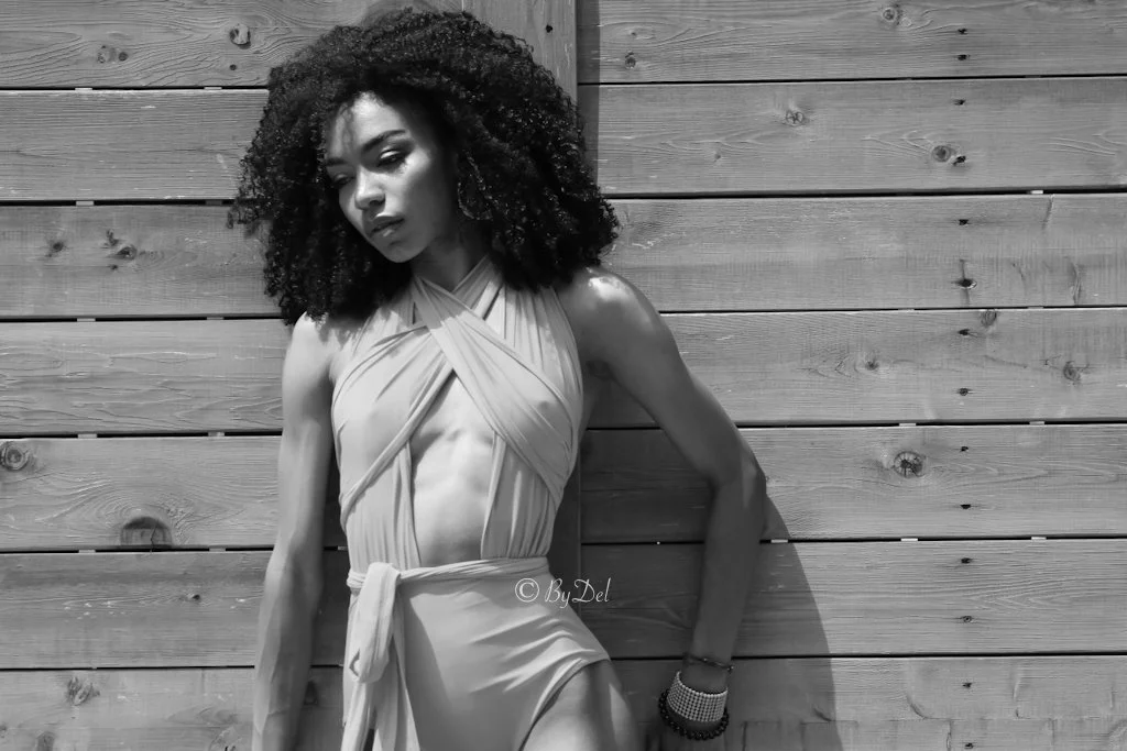 Black and white portrait of a woman with long hair partially covering her face, turning her head towards the camera, wearing a patterned top, in an outdoor setting. View fullsize