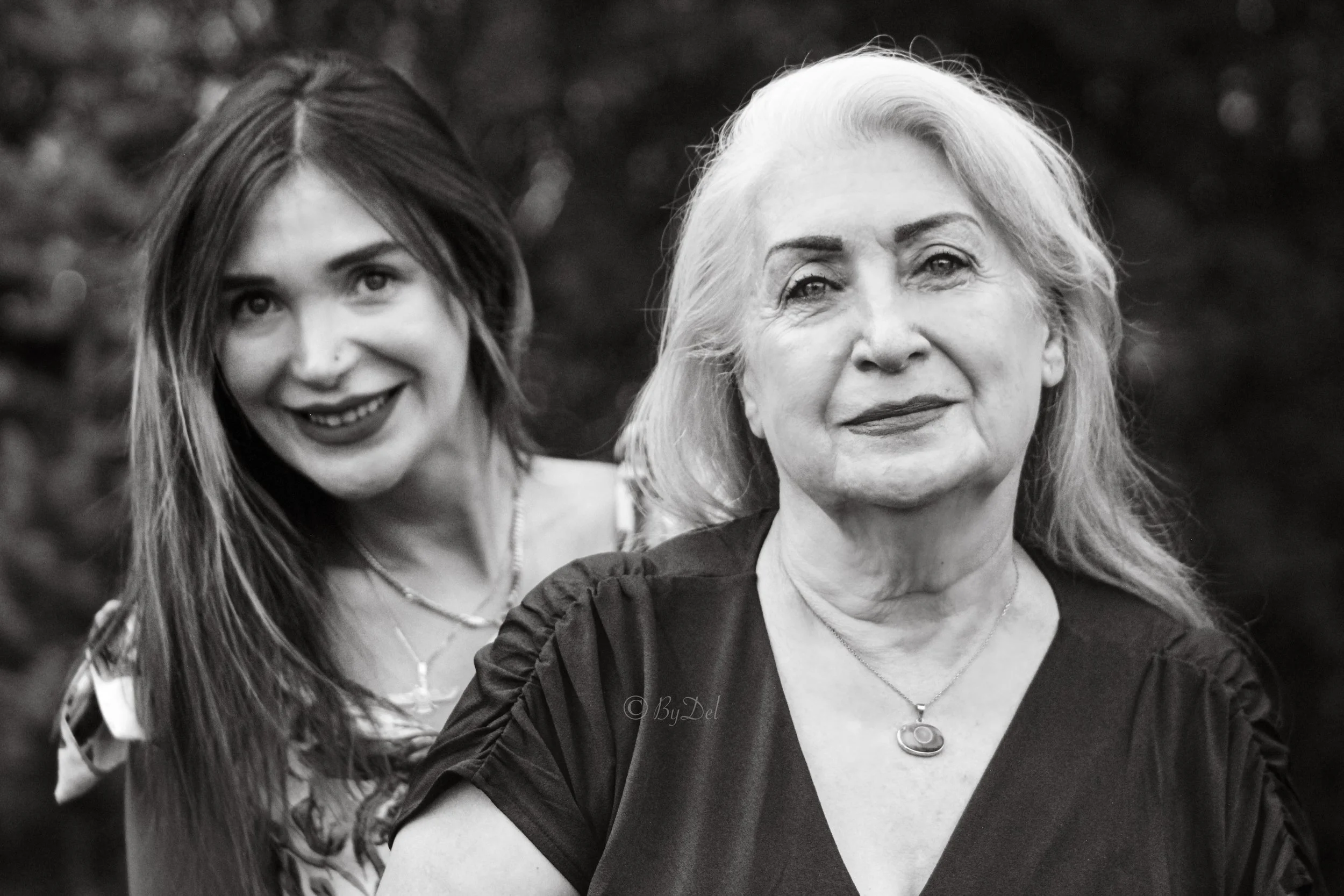 Black and white portrait of two women, one older with long white hair and the other younger with long dark hair, smiling outdoors. View fullsize