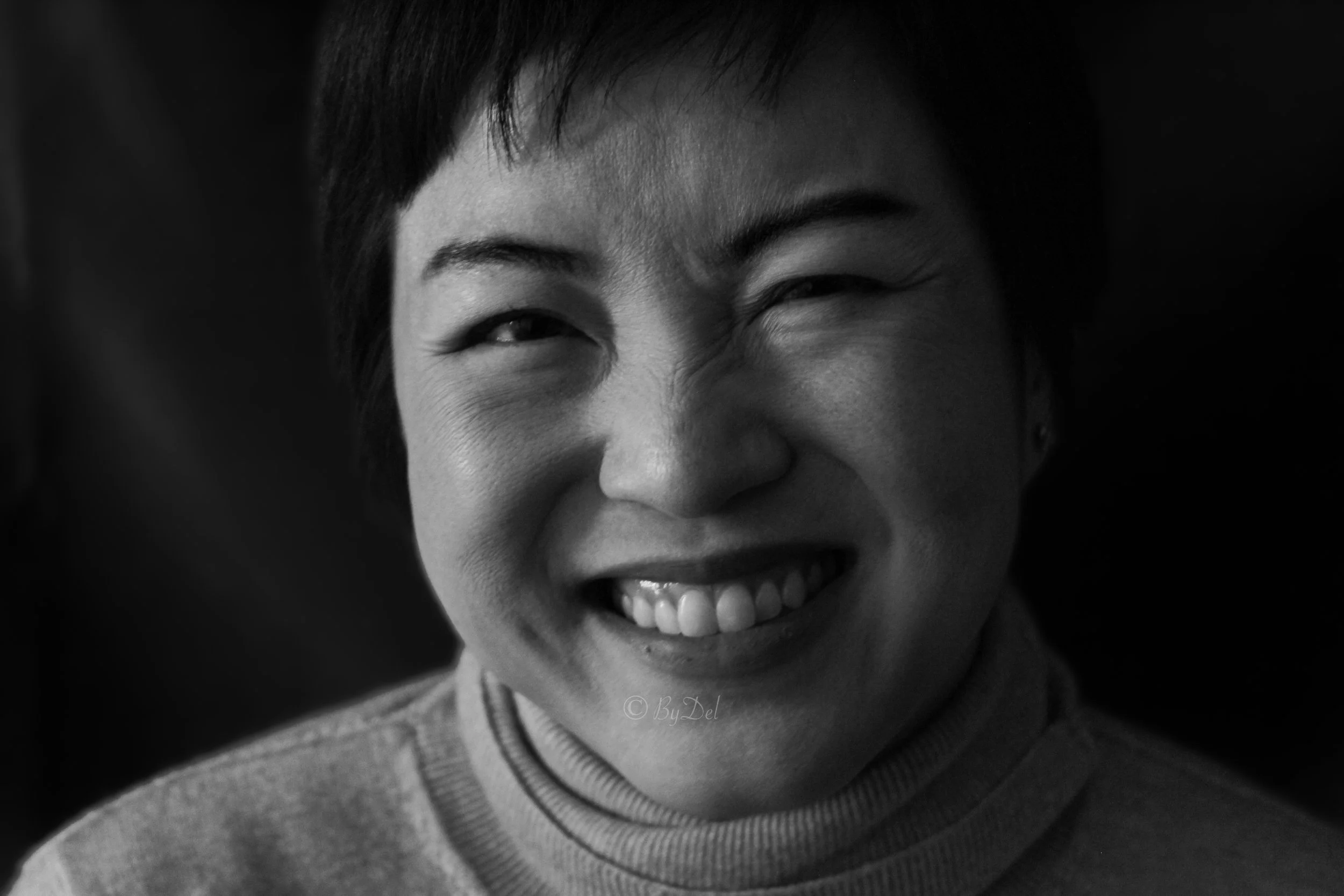 Black and white close-up portrait of a smiling person with short hair, wearing a turtleneck sweater. View fullsize