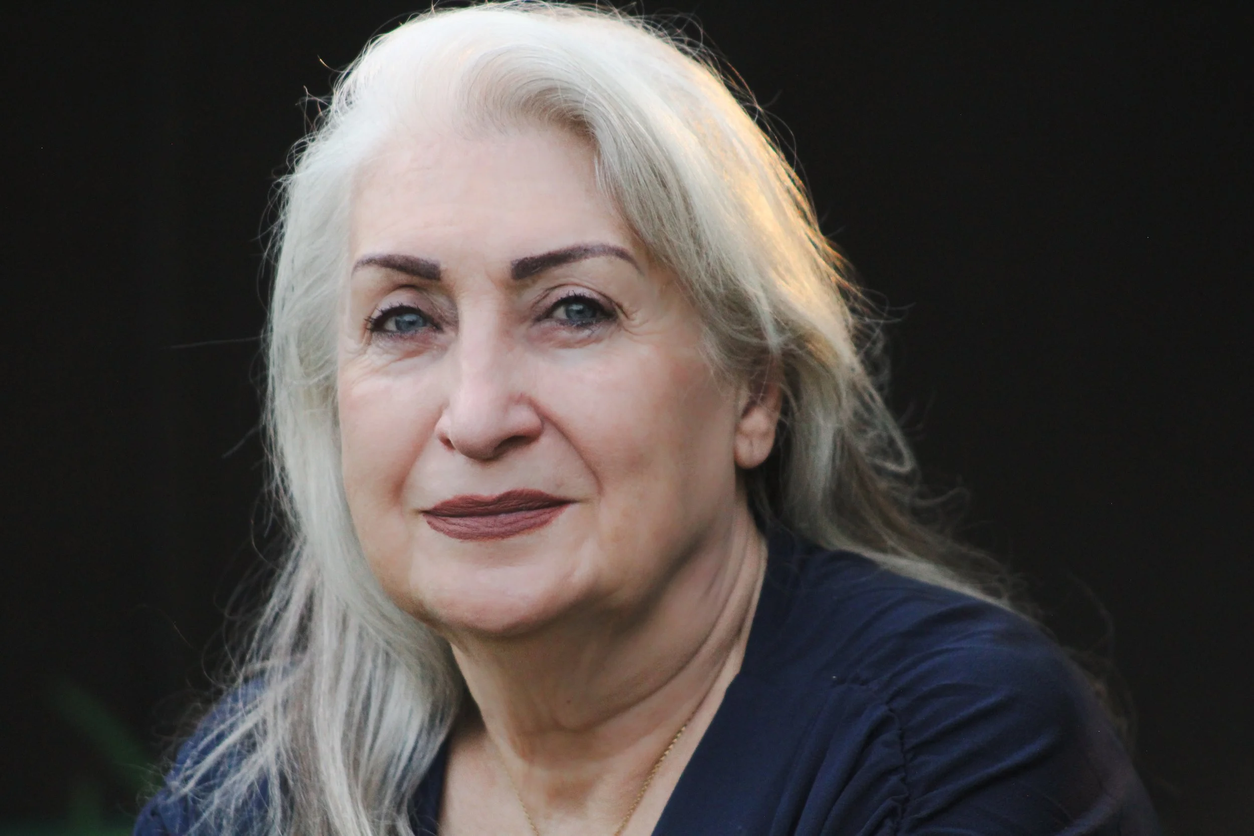 Elderly woman with gray hair and a dark top looking at the camera, dark background.
