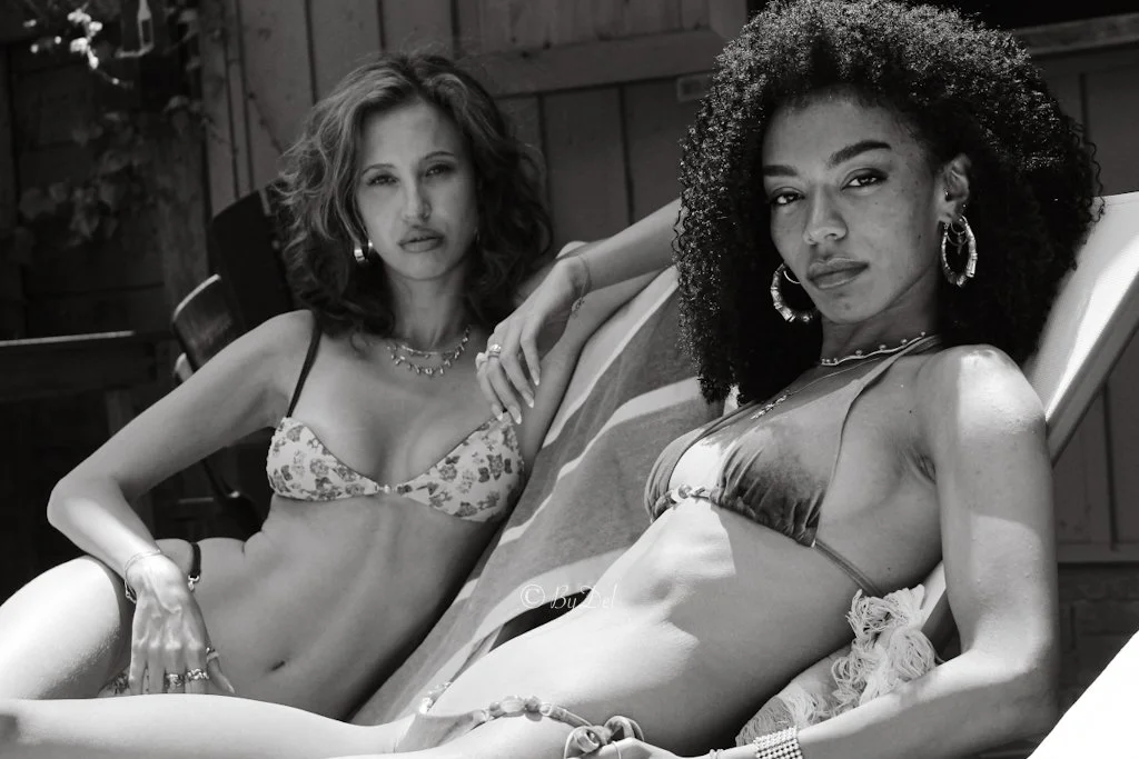 Black and white portrait of two women, one older with long white hair and the other younger with long dark hair, smiling outdoors.
